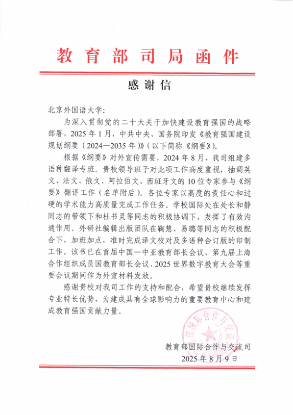 发来感谢信,感谢在《教育强国建设规划纲要(2024-2035年)》的对外翻译工作中,红桃视频